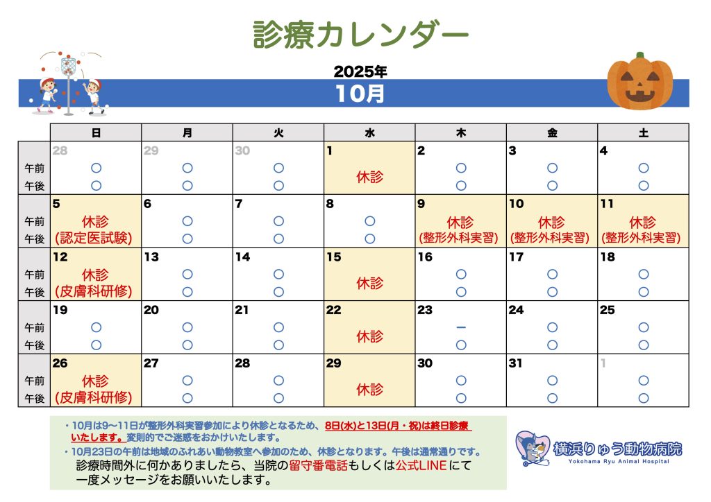 また、10/23(木)は地域のふれあい動物教室への参加につき、午前中は休診となります。午後は通常通りです。