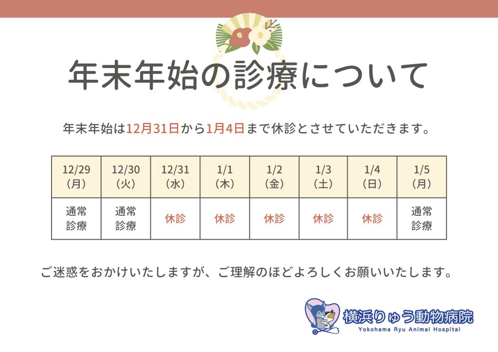 令和7年度の年末年始の診療は以下の通りです。 令和7年 ・12/30(火):終日診療 ・12/31(水):休診日 令和8年 ・1/1(木):休診日 ・1/2(金):休診日 ・1/3(土):休診日 ・1/4(日):休診日 ・1/5(月):終日診療